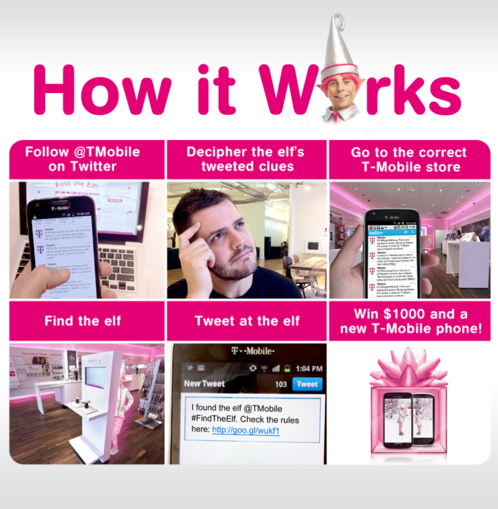 During each Promotion Period a one (1) clue will be Tweeted from the @TMobile Twitter account about which of the T-Mobile® retail locations in that City the T-Mobile® Elf (“Elf”) presently can be found. The Elf will be wearing Holiday clothing with a T-Mobile badge.