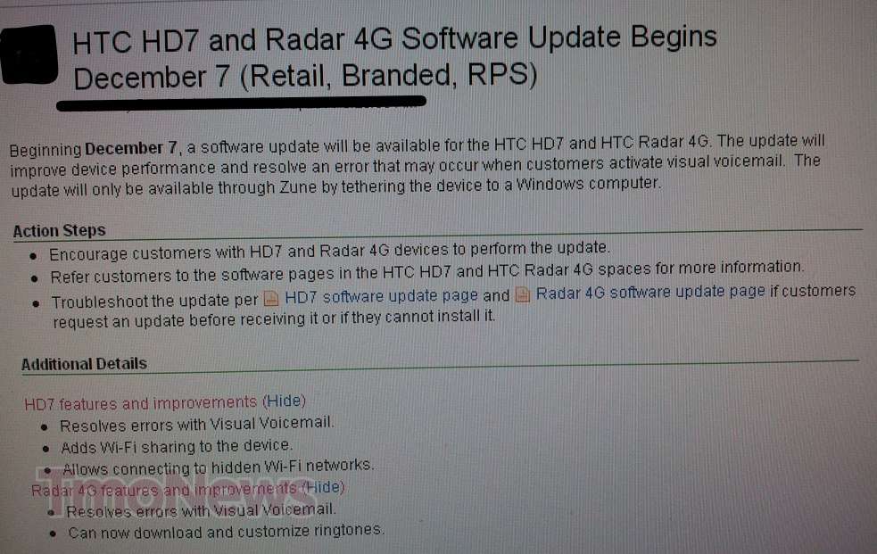 HTC HD7 and HTC Radar 4G owners take note of a new software update beginning tomorrow. This update but includes some important fixes to help improve device performance and resolve an error that may occur when customers attempt to activate visual voicemail. The update will be available through the Zune application on your Windows Computer beginning tomorrow.