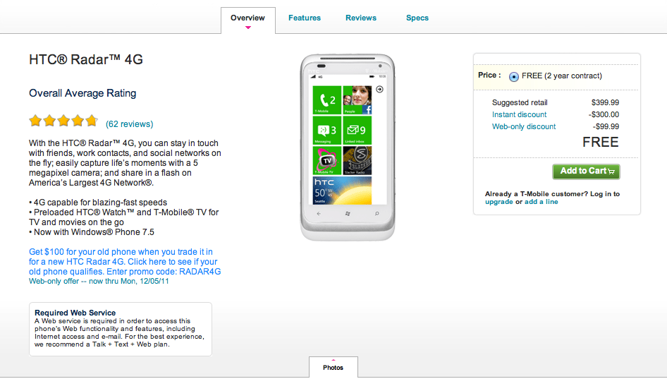Along with your “purchase” of the free HTC Radar 4G on T-Mobile.com, you’ll receive a $25 Windows App Store Gift Card good for any purchases on the Windows Phone Marketplace website. Just visit www.windowsphoneappcard.com and register your purchase, receive your gift card in 6-8 weeks and enjoy $25 worth of goodies.