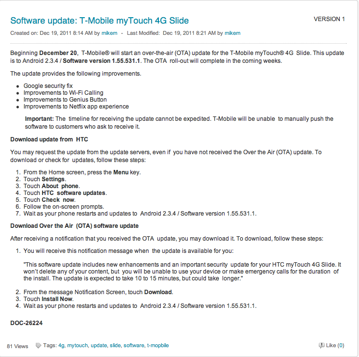 Not to be outdone by its myTouch counterpart, the myTouch 4G Slide is also scheduled for a software update beginning tomorrow, December 20th and continuing as an OTA rollout through January 16th. The update will bring the following improvements and bug fixes: