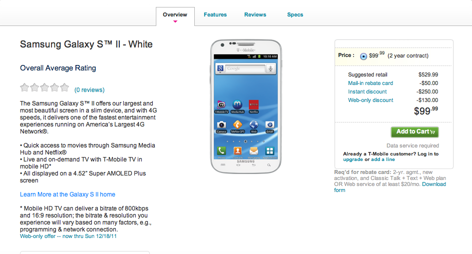 Well, isn’t this a pleasant surprise as T-Mobile introduces a web-only offer on the Samsung Galaxy S II White for $99.99 through Sunday, December 18th. This is a great price and we can’t imagine you’ll find it cheaper anywhere else, especially since you can only buy it through T-Mobile’s website, customer care or telesales. Therefore, you should really take advantage of this promo if the White color is calling your name.