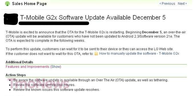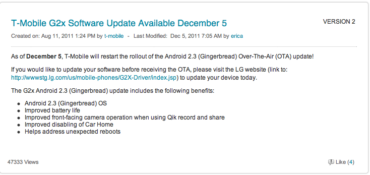 T-Mobile is kicking off another round of Android 2.3 Gingerbread updates for T-Mobile G2x buyers, likely for those people that missed it the first time or purchased the phone without receiving the update. Gingerbread for the G2x brings about the usual list of Android 2.3 additions including improved battery life, improved front-facing camera options when using Qik, improved disabling of Car Home and helps address those nasty unexpected reboots.