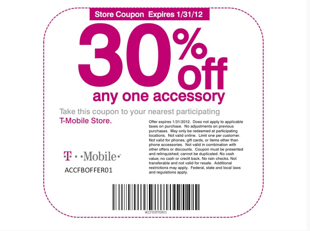 Looking for a quick and easy way to get 30% off any one accessory at a T-Mobile store? Perhaps a stocking stuffer for a loved one? Well, T-Mobile has just provided a 30% off coupon on any one accessory through January 1, 2012. That’s all you have to do. Print out the coupon, present it at the register and save 30%. Any questions?