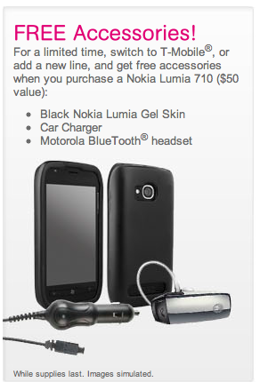 As an extra bonus, switching to T-Mobile or adding a new line will give you a $50 accessory bundle including a Black Nokia Lumia Gel Skin, car charger and Motorola Bluetooth headset, all free.