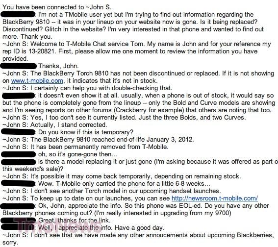 This is one of those unconfirmed but not at all surprising stories centering around the Blackberry 9810 on T-Mobile and the apparent end of its shelf-life. As its missing from the T-Mobile website, we can’t confirm that it is in fact gone, but a T-Mobile customer care chat transcript hints it was given the END OF LIFE due date of January 3rd.