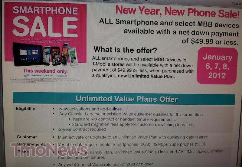 T-Mobile’s “New Year, New Phone Sale” is ready to kick off this weekend and it’s bringing the Value Plan goodness. So what’s the offer? “All smartphones and select Mobile BroadBand devices in T-Mobile stores will be available with a new down payment of $49.99 or less, when purchased with a qualifying new Unlimited Value Plan.” In other words, this sale sounds exactly like the previous sales that have been geared toward the Value Plan side of T-Mobile’s dual-rate plan offer. This appears to be the “winter event” we were expecting after T-Mobile’s winter marketing focus sheet leaked at the end of 2011.