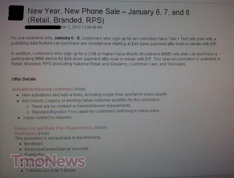 T-Mobile’s “New Year, New Phone Sale” is ready to kick off this weekend and it’s bringing the Value Plan goodness. So what’s the offer? “All smartphones and select Mobile BroadBand devices in T-Mobile stores will be available with a new down payment of $49.99 or less, when purchased with a qualifying new Unlimited Value Plan.” In other words, this sale sounds exactly like the previous sales that have been geared toward the Value Plan side of T-Mobile’s dual-rate plan offer. This appears to be the “winter event” we were expecting after T-Mobile’s winter marketing focus sheet leaked at the end of 2011.