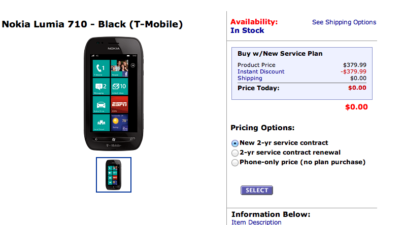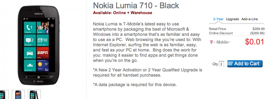 We can’t complain about the $50 price tag T-Mobile has already assigned to the Nokia Lumia 710, but like anyone else, we do love a good deal. Walmart is offering up the Lumia 710 free, either in black or white for new customer contracts with a two-year agreement. You can avoid the contract for just $380 or re-sign for $50, the same price as T-Mobile is charging.