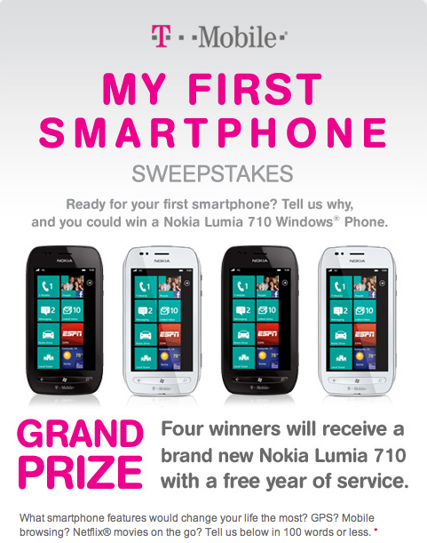 T-Mobile is celebrating the launch of the Nokia Lumia 710 with a sweepstakes where you can not only win one for free, but also grab a year of service along with it. All you have to do is let T-Mobile know, in 100 words or less, “what smartphone features change your life the most?”