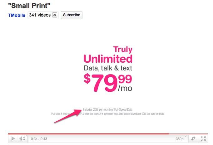 It’s a shady, disgusting move that carriers are pulling and it makes me quickly remember last May when T-Mobile briefly ran a commercial on YouTube. For less than an hour, the commercial poked fun at AT&T for not really having unlimited data. Mind you this was back in May of 2011, so the commercial ran while AT&T and T-Mobile were in the midst of takeover talks, but that didn’t stop T-Mobile from taking a few pot shots at AT&T’s use of the word “unlimited.” So what did I do? I called T-Mobile out on it, grabbed a few screenshots and watched T-Mobile take the video down never to be seen or heard from again. I think the picture below tells the whole story.