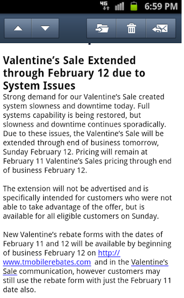 With February 11th now in our rear-view mirror, those of us in the T-Mobile world are taking stock of yesterday’s Valentine’s Day sale. We’re beginning to make a little more sense out of the system slowdown that appears to be the result of too many people shopping in T-Mobile stores at once. On the one hand, that’s a great thing as this sale was obviously the “right” kind of sale to draw in customers, where the Value Plan sales had failed to draw in similar crowds. Unfortunately, that same crowd was also a contributing factor to the system slowdown that brings where we are today: an extra day for the sale. (This isn’t the first instance we’ve seen a popular promotion leading to a system crash for the nations wireless carriers and it certainly won’t be the last time either.)