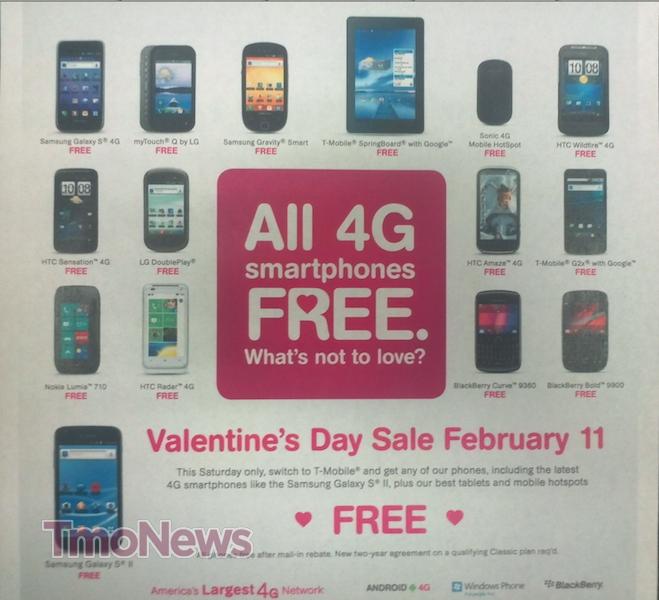 If you’re hoping for more details on T-Mobile’s Valentine’s Day sale this upcoming Saturday, you’ve come to the right place. “For one day only, Saturday February 11th, new and existing customers can purchase any phone on any of T-Mobile’s Unlimited Classic or Value Plans and receive a Mail-in Rebate, bringing the 2YC (year-contract) subsidy price to FREE or the net device down-payment to $0.00.”