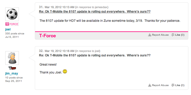 Word coming out of the T-Mobile support forums tells us T-Mobile is ready to roll out the Windows Phone 8107 update to the HTC HD7. The 8107 update introduces a number of changes including a fix for the disappearing keyboard bug. Take a peek at your Zune or Mac Windows Phone Connector for any notification of the update. Word comes straight from Joel, a T-Mobile Forum moderator who wrote “The 8107 update for HD7 will be available in Zune sometime today, 3/19. Thanks for your patience.”
