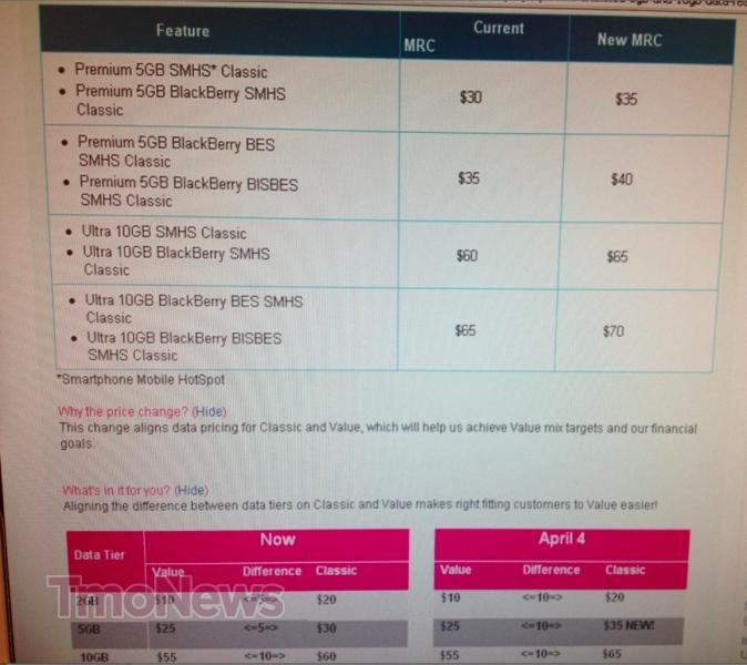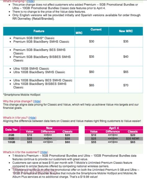 Beginning April 4th, T-Mobile will increase the price of the Premium 5GB Promotional Bundles and Ultra – 10GB Promotional Bundles Classic data features by $5 per month. The currently available Classic 5GB and 10GB promotional bundles will be replaced with new plans and a $5 monthly rate increase.