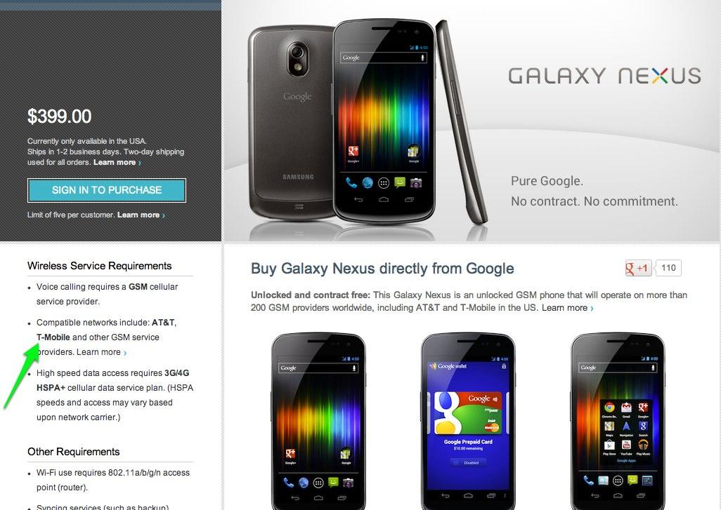 Whoa, big big news from Google as they release an unlocked Galaxy Nexus device available directly from the Google Play store for $399.99. This unlocked, pentaband device supports HSPA+ 21Mbps and will work perfectly on T-Mobile’s network. As you see in the picture, T-Mobile is even highlighted as a supporting network along with other GSM carriers in the United States. This is an incredible offer and easily the best price we’ve seen on an unlocked Galaxy Nexus yet.