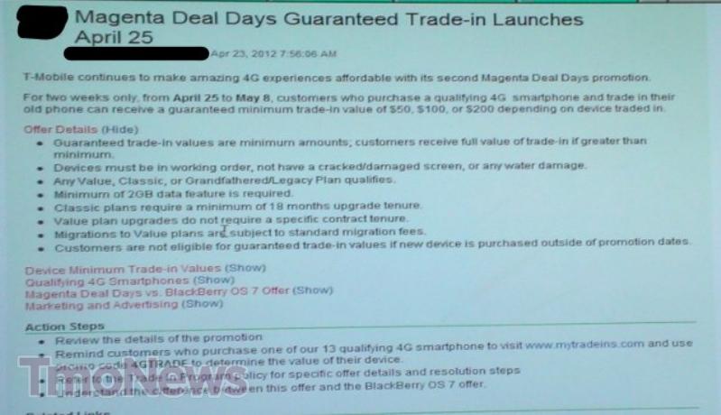 BELLEVUE, Wash. — April 24, 2012 — Cleaning out your tech closet to trade in an old phone for a trade up to a super-fast 4G smartphone has never been easier or more affordable than during T-Mobile’s new “Magenta Deal Days” promotion. Customers have the opportunity to receive a guaranteed trade-in value of $50–$200 when they exchange their old working phone and upgrade to a new, super-fast T-Mobile 4G smartphone. The two-week sale will take place from Wednesday, April 25, through Tuesday, May 8.