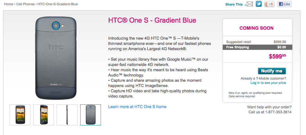 The HTC One S has been present in one form or another on T-Mobile’s website since they announced the device back at HTC’s unveiling of the One series of smartphones. This new-ish page for the HTC One S has a terrific list of all the features available on the One S, hitting store shelves a week from today on April 25th. Most notable is the $599.99 full retail pricing, a price we hope drops to $549.99 in the very near future.