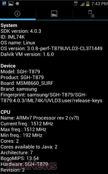 The screenshots may seem fishy, but I believe they may be genuine. For example, the leaked ICS build for the AT&T Galaxy Note has the build number of IML74K.144, indicating the build date and it is the 144th custom build. The SGH-T879 has the same build number because it was built from the same sources at the same time, meaning that it is indeed a brother to the AT&T Galaxy Note. The build servers and time stamp match up with Samsung’s official build information. We know that this build is intended to be an official build because the build number is suffixed with the baseband version instead of a decimal number indicating a custom build that voids the warranty. The pattern holds true when you look at the build numbers for official ROMs from Samsung for the Samsung Vibrant, the Galaxy S 4G, the Galaxy S Blaze 4G, and the Galaxy S II. Furthermore, the images are scaled down directly from 800×1280, and they match what we know for Samsung’s TouchWiz interface to look like in Android 4.0.
