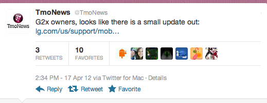 A quick note for all you T-Mobile G2x owners out there as a minor update has been released, removed and then re-released by LG. There are some early reports about improved battery life, but mostly you’ll just notice a bump from Android 2.3.3 to Android 2.3.4. There is still no word from T-Mobile or LG on an official Ice Cream Sandwich release — we’re still holding out hope though.