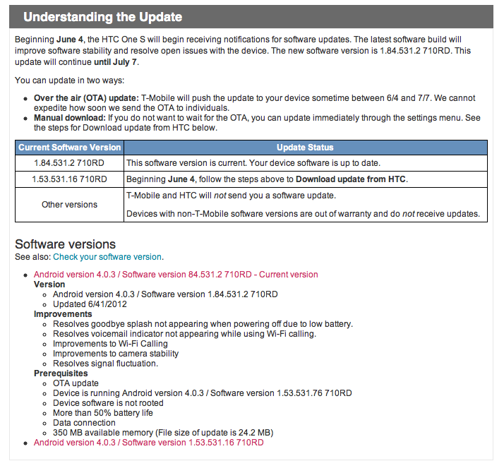 The HTC One S is set to receive a software update beginning June 4th which T-Mobile is billing as “improving software stability and resolving open issues with the device.” There will be two ways to receive the update, the Over-The-Air (OTA) update will arrive anytime between tomorrow, June 4th to July 7th. The Manual Download can be achieved by going through the phones settings menu to try to pull the update to the phone. To grab the update manually, go to Settings > About phone > Software updates > Check now and follow the on-screen prompts.