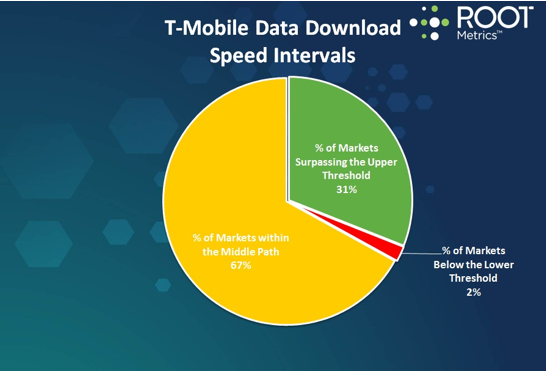 In order for a carrier to qualify as above the “upper threshold” in each market, the carrier had to deliver download speeds above 3Mbps in at least 70% of the tests for a given market. At that speed, it would take 10 minutes or less to download a 30-minute television show in standard definition and 10 seconds or less to download a music file. The “lower threshold” shows a carriers download speeds of at least 1.5% in at least 60% of the tests in a given market. The “middle path” indicates the percentage of markets in which a carrier neither exceeded the upper threshold nor fell below the lower threshold.