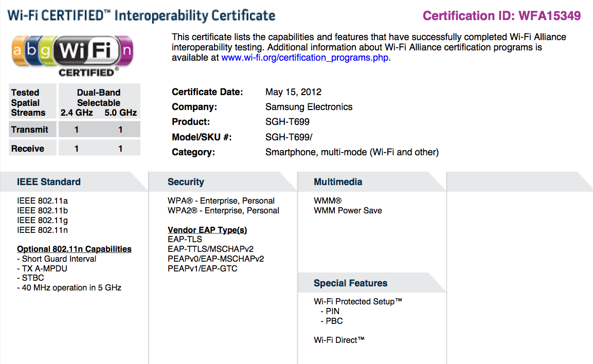The Samsung SGH-T699 is one step closer to release on T-Mobile as it receive Wi-Fi certification on May 15th. We’re still at a loss as to what exactly the T699 is, be it an existing Samsung model or an entirely new smartphone. At this point, it’s a 50/50 shot, though we’ve guessed at least once that this could be the Galaxy Nexus. It’s a wild theory to say the least, but at this point the T699 could be anything so why not throw the Galaxy Nexus name out there. Hopefully we’ll figure out what the T699 really is soon enough.