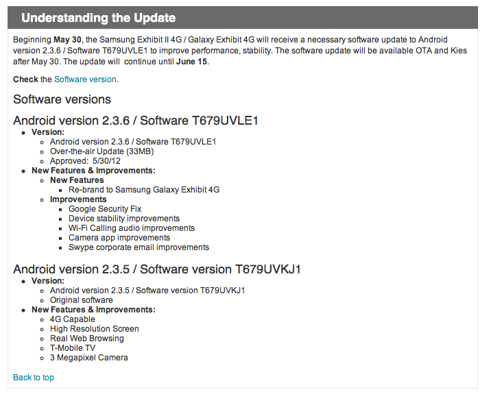 Can’t say I have a good explanation for this one as T-Mobile posts a new support document for the Samsung Exhibit II 4G, soon to be known as the Samsung Galaxy Exhibit 4G. Is Samsung concerned with putting these devices under the Galaxy umbrella or is T-Mobile utilizing the power of the Galaxy name to sell some more handsets? Either way, “Galaxy Exhibit 4G” fans have a software upcoming incoming which includes some notable changes. The software will be available OTA and via Kies beginning May 30th continuing through June 15th.