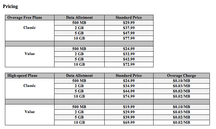 The “overage-free” data plans allows businesses to control the cost of monthly data usage with plans that slow data speeds down when users reach their data allotments instead of incurring overage charges. The “high-speed” data plans do not slow speeds, instead applying overage charges ranging from $0.02 to $0.10 per MB depending on the data plan choice.