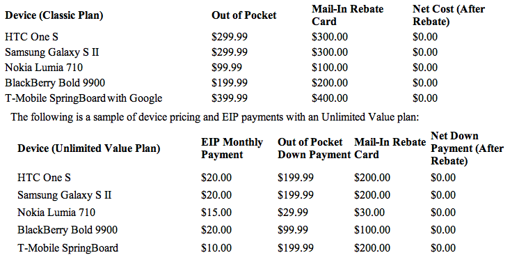 For example, on a classic plan the HTC One S is $299.99, with a $300 mail-in rebate leading to a net cost of $0.00. I don’t know why T-Mobile raises their prices on these handsets prior to these sales, but as long as they are free after mail-in rebate, it is what it is.