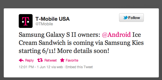 Samsung Galaxy S II owners: @Android Ice Cream Sandwich is coming via Samsung Kies starting 6/11! More details soon!