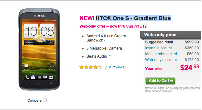 I don’t generally post T-Mobile.com special offers anymore as they are an almost daily occurrence, but the HTC One S selling for just $24.99, that’s worthwhile mention. Sure, it would be nice if the Galaxy S III was selling for this price, but the HTC One S is arguably the “second-best” Android handset in T-Mobile’s lineup now. I’ll leave it to you guys to decide what phone is truly the “best,” but if you’re looking to add-a-line or start a new T-Mobile account, this is one deal you can’t pass up. The deal runs through tomorrow, July 15th so don’t want too long.