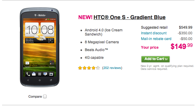 Looking for a cheap deal on the HTC One S with a new line of service or add-a-line on T-Mobile? Check out the deal on T-Mobile’s website now, good through August 21st for $149.99 after a $50 mail-in rebate. No word on if this deal works for qualifying upgrades, but new and add-a-line customers are good to go!