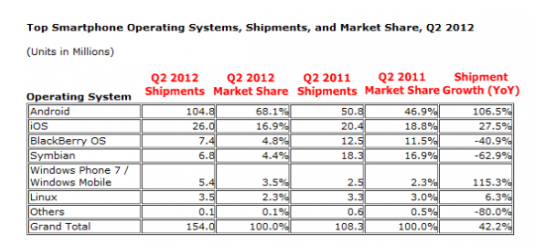 According to the latest report from the IDC, Android and iOS now account for more than 85 percent of the 152 million smartphones shipped in the second quarter of 2012. More important is the 68.1 percent of all smartphones shipping running the Android platform. That number is up from 46.9% in the second quarter of 2011, with iOS now sitting at 16.9%. With many smartphone owners waiting for the next-generation iPhone, iOS saw double-digit growth in the second quarter, but that’s where the good news ends, at least for the two largest smartphone platforms.