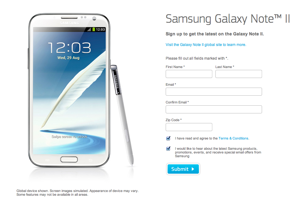 With Samsung introducing the Galaxy Note II to the world, those of us stateside are left wanting more details on US availability. Thankfully, Samsung has launched a sign-up page, which will send more information as it becomes available. All it takes is a name, email and zip code to get all the deets. Of course, we’ll be providing all the info we can on the Galaxy Note II and potential T-Mobile availability anyway, but it never hurts to have a little redundancy in your life.