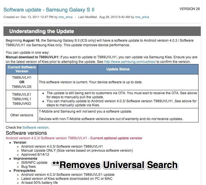 Yesterday’s update for the Galaxy S II on T-Mobile may have peaked our interest with the addition of an ISIS update, but it’s the remove of Universal Search that our attention today. An eagle-eyed Android Police reader, along with a host of you in the comments and on Twitter caught the removal of the feature from the device after the update.