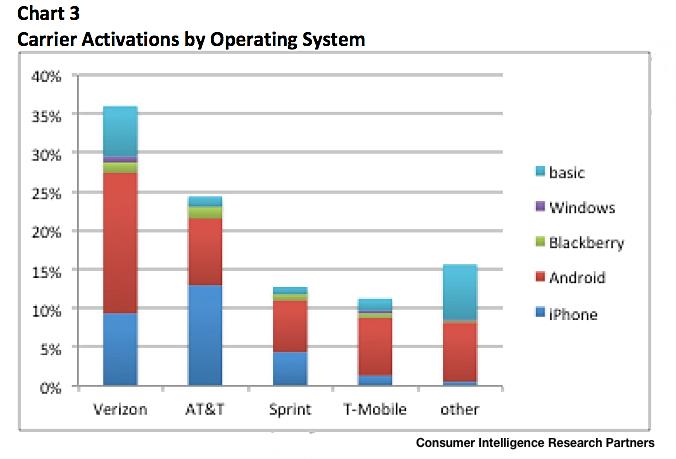 There’s little surprise for Verizon as they take the award for most Android activations, and the case is the same with Sprint and T-Mobile. However, for AT&T, the original iPhone exclusive partner, iPhone activations still defeat Android with Apple making up more than half of AT&T’s total activations during the survey’s time period.