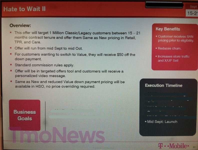 The “Hate to Wait II” promotion will offer more than 1 million Classic/Legacy customers between 15-21 month the same pricing as new customers would receive. This offer will run from the middle of September and end in mid October. This is the kind of deal T-Mobile should be running, and a way to easily earn some good favor with existing customers.
