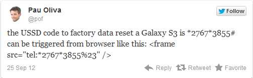 Samsung Galaxy S II and S III owners beware as an exploit caused by a single line of code can cause an unstoppable factory reset of your Samsung device. Posted by Pau Oliva earlier in the day, the code was at first only thought to affect the Galaxy S II however, new reports since this morning have indicated that a number of other Samsung devices, including the Galaxy S III suffer from the same exploit.