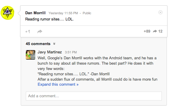 Update: Google employee Dan Morrill is having a good laugh at the latest round of rumors with a simple “Reading rumor sites…. LOL.” comment on Google+. When pressed for more information, Morrill wouldn’t disclose which site(s) he was referencing, but I think the below information is the pretty obvious choice. It’s possible that Morrill is laughing out loud because of how dead on this information is, or how very, very wrong it is. Hopefully we’ll find out soon enough.