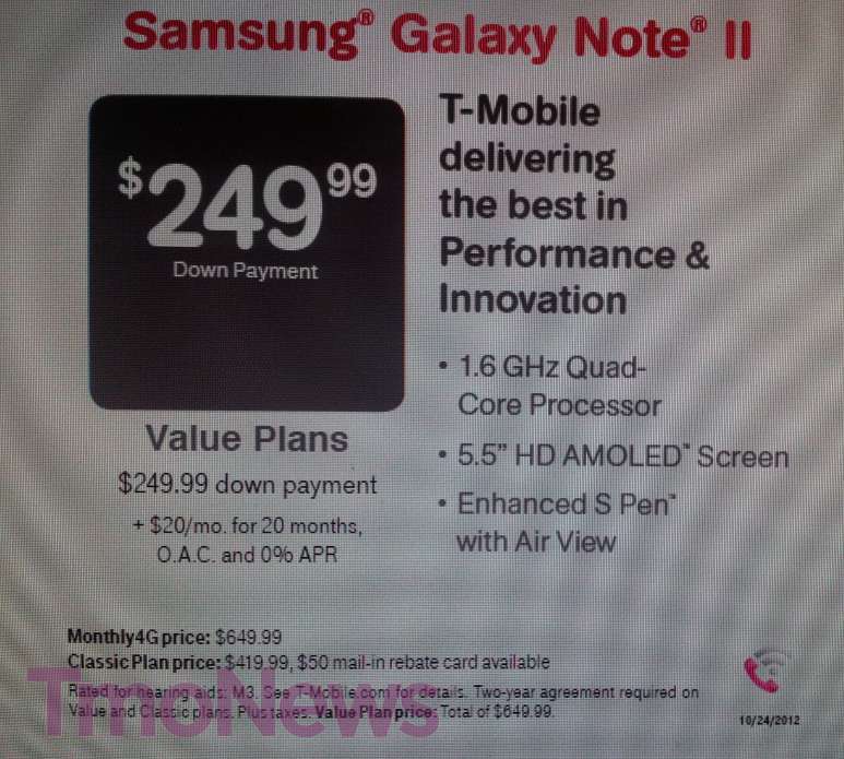 With another set of leaked pricing hinting at a $369.99 Classic Plan price (after $50 mail-in rebate) and price cards dated for tomorrow, all signs point to a Galaxy Note II launch tomorrow. Is it possible we will see a midnight announcement from T-Mobile with availability beginning bright and early tomorrow morning? We hope so and if we do I hope you all have your credit cards ready and hopefully, an upgrade ready and waiting as well.