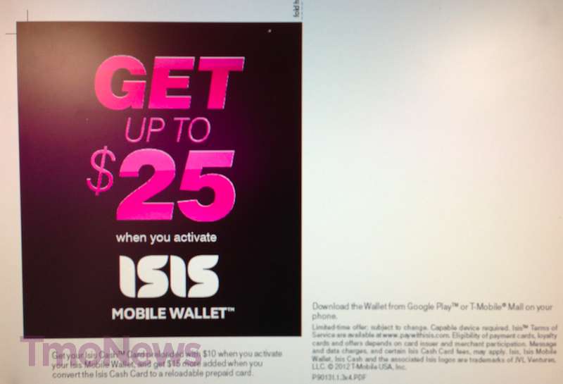 In order to use the ISIS Mobile Wallet service, you’ll have to use an ISIS SIM card with the Galaxy S III, Galaxy S III and Galaxy S Relay 4G smartphones. As an added bonus, the second image indicates a special offer for up to $25 in “ISIS cash.” That’s good for $10 when you activate your ISIS mobile wallet and another $15 if you convert the ISIS cash card to a reloadable prepaid card. We’re not exactly sure how the last part works, so we’ll have to wait for official word from T-Mobile and its ISIS partners.