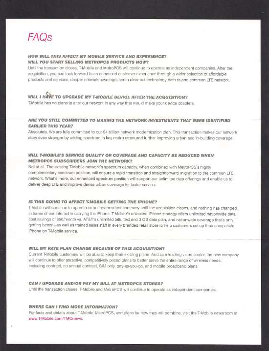 Interestingly enough, there’s a question about how this deal affects the iPhone, which of course it doesn’t seem to change anything. It also highlights the fax that until the deal is finalized, T-Mobile and MetroPCS stay two separate, independent companies. Moreover, this deal doesn’t affect T-Mobile’s wish to push forward with the network investments that they’ve discusd since earlier this year.