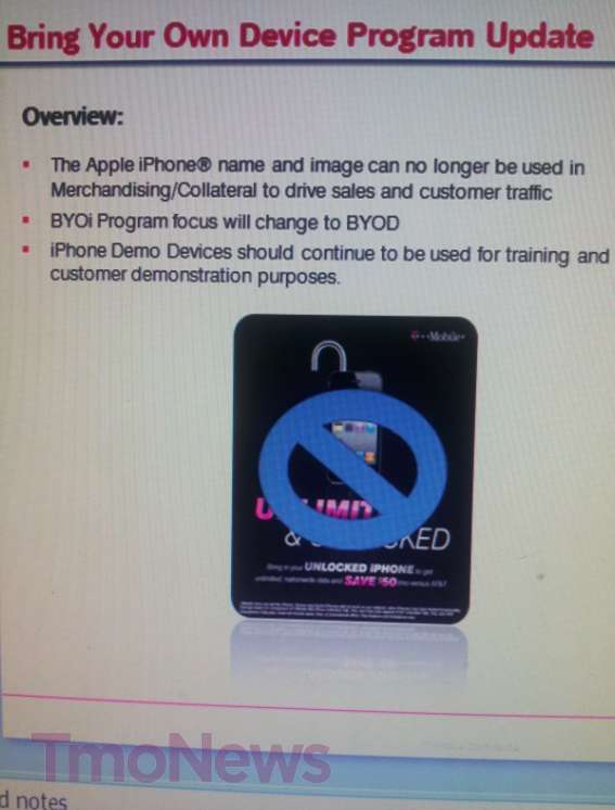 Here’s a piece of news I think a number of us had predicted would come as T-Mobile sends out a memo indicating the “Apple iPhone” name can no longer be used in conjunction with marketing for the “Bring Your Own Device” program. Now, let’s be clear and say we don’t know the reasons for this, it could be a T-Mobile management decision, an Apple legal decision, a T-Mobile legal decision or something else entirely. In other words, I wouldn’t jump to conclusions.