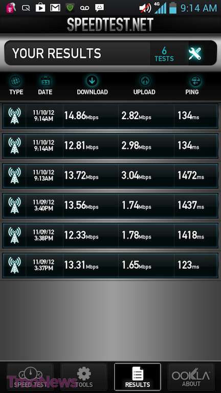 Voice calls on T-Mobile’s network came through loud and clear, and volume in the earpiece was louder than average. Callers on the other end said I sounded clear and had no problems making out my voice. At the loudest level, the speakerphone sounds like a fuzzy, but that’s not an uncommon experience for me on most phones. Speeds on T-Mobile’s 4G HSPA+ network averaged in the 10–14Mbps range and I rarely hit single digits during any of my speed trials. I never really hit EDGE in my area, except when I’m using my iPhone but I can tell a definite difference in voice quality over HSPA+. I didn’t experience any dropped calls with the L9 and it held on to its signal even when deep inside department stores or the back of Target and Publix, areas that are notorious for me to lose signal strength.