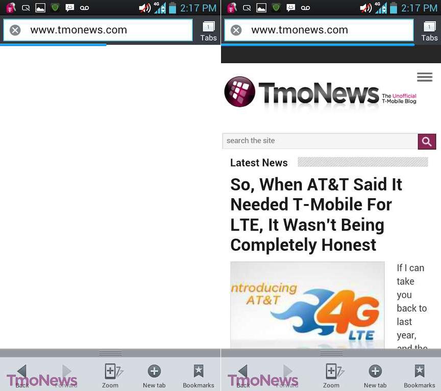 One interesting aspect of the stock browser is the toolbar that pops up which includes back/forward keys, new tab, bookmarks and a zoom function to help navigate smaller font web pages.
