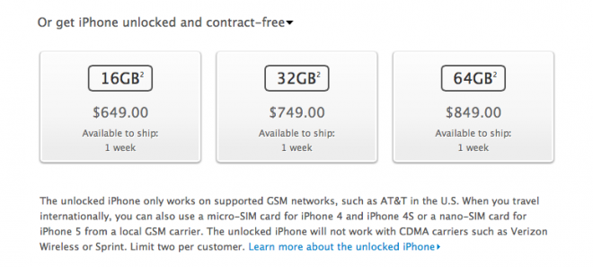 Just as the world expected, Apple has released unlocked iPhone 5 units available from its online store as of earlier this week. The unlocked device price range will fall in line with our anticipated price models beginning at $649, $749, and $849 for 16GB, 32GB and 64GB of storage, respectively. All three models are listed as shipping in one week.