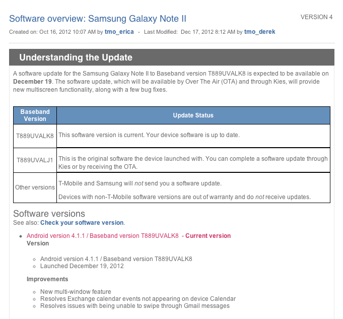 A software update for the Samsung Galaxy Note II to Baseband version T889UVALK8 is expected to be available onDecember 19. The software update, which will be available by Over The Air (OTA) and through Kies, will provide new multiscreen functionality, along with a few bug fixes.