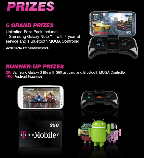 Runner-Up Prize (20 winners): Each Runner-Up Prize winner will receive one (1) Samsung Galaxy SIII mobile phone with a $50 T-Mobile gift card redeemable for products and services, including without limitation, one (1) month prepaid T-Mobile service and one (1) MOGA mobile gaming controller. ARV: $699.99 each.