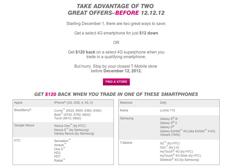 T-Mobile’s newest Holiday promotion kicks off today with the “12 Days of Value” offering two great offers running through today, December 1st and ending December 12th. Select a great 4G smartphone for just $12 down (Value Plan), or get $120 cash back on a select 4G smartphone when trading in a qualifying smartphone from the list below.