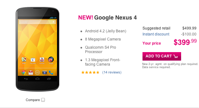 No, your eyes are not deceiving you as the Nexus 4 returns to T-Mobile.com for $399, subsidized. Say what? Honestly, if I were a betting man I’d put good money on this just being an accidental typo. In the case of the Nexus 4, we’ve seen a history of typos so there’s some precedence to believe T-Mobile’s website needs some better proofing. I cannot envision a scenario where T-Mobile decided to kick up the subsidized price up $200 basically overnight. Never mind that the Nexus 4 sells for $50 less, subsidy free from the Google Play Store.